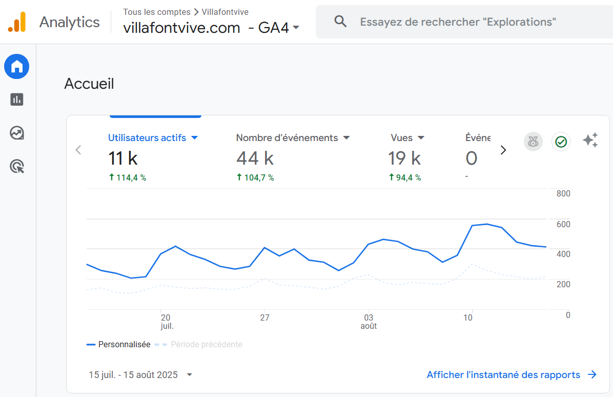 capture d’écran Google Analytics pour mon site villafontvive.com